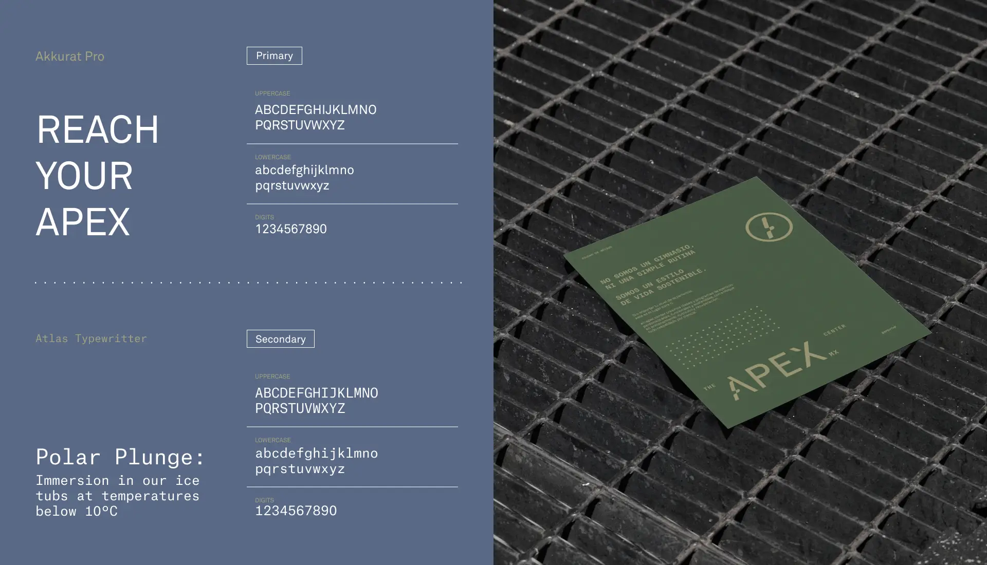 Brand identity: Science meets aspiration Apex became a brand that, in every word and every graphic, communicated its new science-based identity—and reflected the mindset and attitude of its members. Its typography’s angles convey strength and decision, complemented by the “A” staircase detail and dissected isotype. Soft, urban-inspired earth tones evoke discipline and consistent growth—because, even if most of the fitness world disagrees, energy alone means nothing.