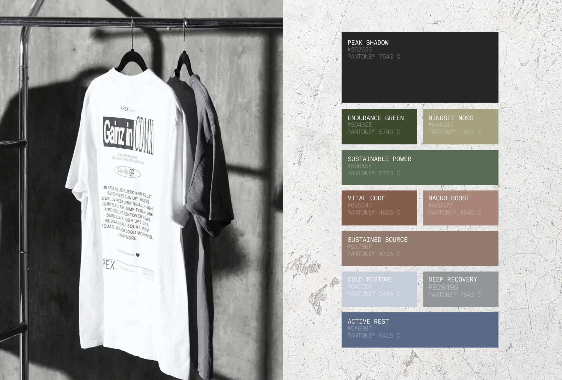Then we thought visually. We came up with something simple—yet something that would become deeply meaningful to the brand. A triangle. Conceptually, the triangle brought together the three essentials: training, nutrition, and community. It also inspired the design system: a medium-weight sans-serif typeface for clarity and legibility, the “A” staircase detail referencing Apex, and a dissected isotype with subtle motion accents for flexible applications. Clean grids, abstract elements, and an urban-inspired color palette reflect routines, processes, and energy, giving the brand a structured yet adaptable visual identity.